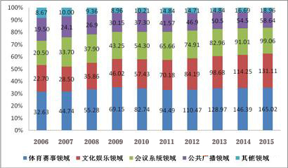 我國專業音響行業的主要下游應用領域為體育賽事、文化娛樂、會議系統、公共廣播等行業,得益于近年來國家宏觀經濟的強勁增長,這些行業發展迅速,對專業音響的需求與日俱增,其在專業音響市場結構中的比例也逐漸上升。2006—2010年,上述四大應用領域對專業音響的需求取得了穩步增長,而受益于國內文體事業的蓬勃發展,體育賽事、文化娛樂領域更是增長強勁,從2006年開始就占據了53.20%的市場份額。