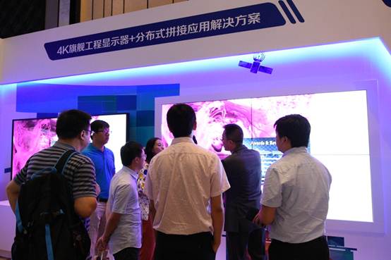 而“4k旗艦工程顯示器+分布式拼接應用解決方案”當之無愧成為活動當天最具有磁場吸引力的方案之一,現場4臺2*2超窄屏系列4K旗艦工程顯示器X554UNS進行拼接,同時與一臺98寸4K旗艦工程顯示器X981UHD進行對比,擁有高達3840 ×2160的4K分辨率,保證了超清的畫質效果,捕獲了觀眾的注意力,加之NEC特有的專用色彩引擎配合SpectraView Ⅱ軟件可以對顯示器進行亮度,黑場亮度,色彩空間,白點,Gamma曲線做精確的色彩調節,輕松快捷實現專業色彩管理,引領了一個新時代的視覺體驗。
