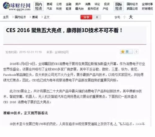 CES 2016是一個(gè)世界級(jí)頂尖創(chuàng)新和展示舞臺(tái),對(duì)于意欲將裸眼3D技術(shù)推向全球的康得新來說,這無疑是極好的機(jī)遇。在用戶對(duì)于3D剛性需求基礎(chǔ)上,在行業(yè)的共同努力下,康得新正在乘勢(shì)而上,以“中國制造”走出國門,走向世界創(chuàng)新平臺(tái),引領(lǐng)全球3D發(fā)展新格局。
