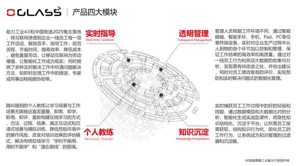 0glass是國內第一家專注工業級AR智能眼鏡和算法研發的企業,也是國內工業AR領域的領導者。目前已推出AR智能眼鏡0glass Pro 2、0glass danny兩大硬件產品。軟件方面,0glass用的AR眼鏡有核心的算法。據了解,國內很多做AR算法的公司,其算法沒有數據分析能力,而0glass做到了。0glass自主研發了全球第一款專門針對工業領域的AR算法——NginABC引擎,以及基于此引擎開發的AR全終端工作輔助系統PSS,為一線員工提供實時指導、透明管理、個人教練以及知識沉淀等功能。