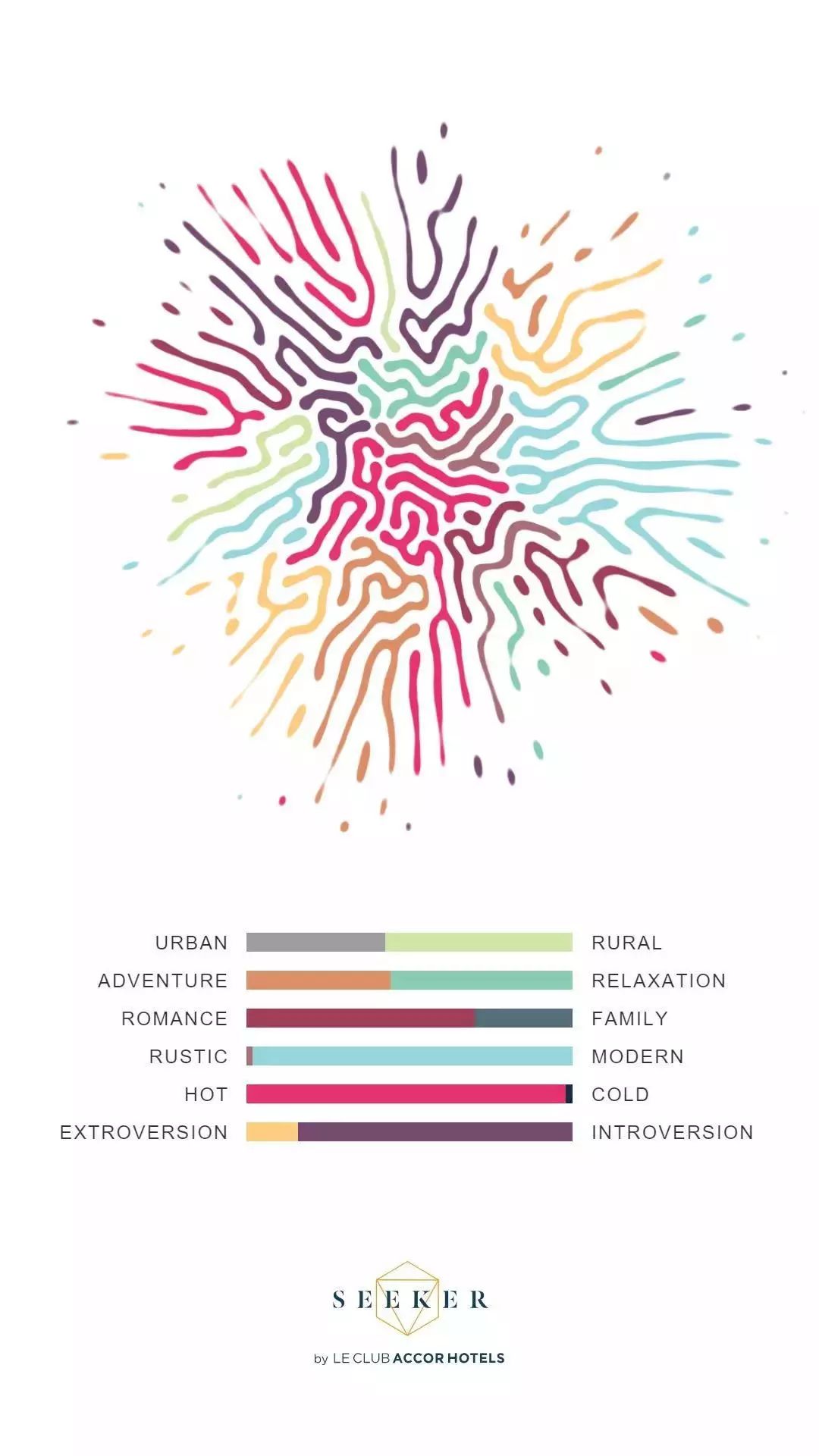 最后,算法會計算出六個關鍵指標并以可視化的形態表示出來:城市或鄉村,冒險或輕松,浪漫或家庭,自然或現代,熱或冷,外向與內向。每個人都可以得到像指紋一樣獨一無二的個性情感畫像和旅行資料,可以據此為你建議符合相同指標的旅行目的地。