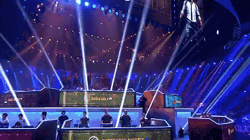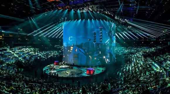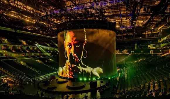 舞臺中心有個巨大的360°圓柱紗幕,《絕地求生》的場景不斷的在投影幕墻中變換。