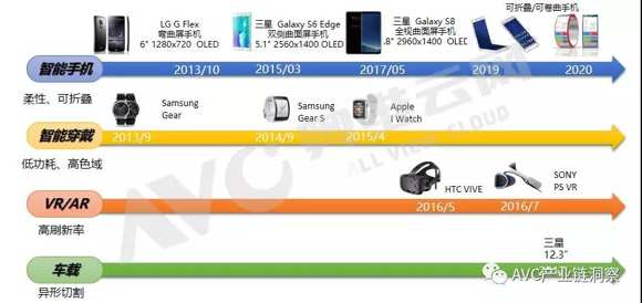 在手機OLED應用上,手機OLED屏幕由16:9到18:9,由Curve到Foldable再到Rollable,隨消費者需求,變化明顯;在智能穿戴上面,由于OLED技術低功耗、高色域的顯示特性,AMOLED及PMOLED技術基本占據穿戴顯示技術八成以上的份額;在VR/AR虛擬顯示上面,由于OLED高刷新率的顯示特性,隨著VR/AR市場的逐步成熟,OLED技術的應用也將逐步增長;另外,由于車載顯示對屏幕外形有著特殊需求,如異形切割、環駕駛艙顯示等趨勢,也為OLED帶來機會;綜上所述,OLED技術的顯示特性決定OLED不僅僅應用于智能手機,仍將廣泛應用于穿戴、VR/AR、車載等市場帶來機會。