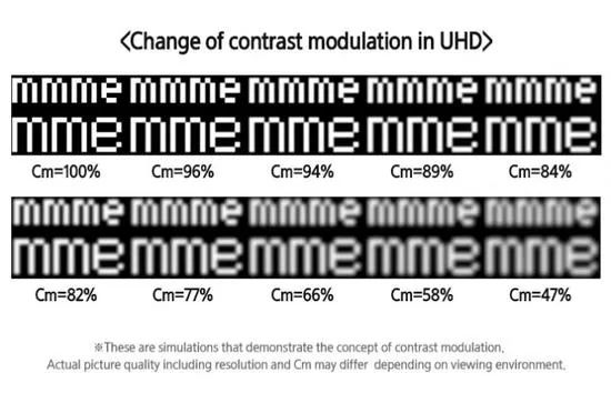 8K電視因橫向有接近8000個像素點而得名,分辨率是傳統4K電視的4倍。按照ICDM的規定,8K電視的CM也必須超過50%,而這也正是LG電子質疑三星電子的主要依據,他們認為8K分辨率不僅必須要有3300萬像素--7680×4320像素的結果,而且必須要擁有超50%的CM,三星實際上是在欺騙消費者。