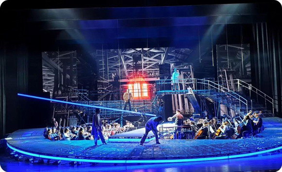 在舞美設(shè)計(jì)方面:舞臺(tái)整體呈圓形,樂隊(duì)在舞臺(tái)中間,包圍樂隊(duì)的是一個(gè)弧形,弧形前驅(qū)是一個(gè)斜坡的通道,兩邊上去后是一個(gè)高的平臺(tái),為合唱隊(duì)提供了演出空間及高支點(diǎn),同時(shí)也是戲劇表演的空間。中區(qū)有一個(gè)貫穿平臺(tái),是角色演員的特殊通道。視覺上非常重要,在大的結(jié)構(gòu)里再把其他的通道進(jìn)行連接,提供了非常豐富的表演空間,上下錯(cuò)落,前后穿插。