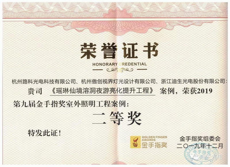 由浙江迪生光電股份有限公司、杭州路科光電科技有限公司、杭州傲創(chuàng)視界燈光設(shè)計(jì)有限公司共同合作亮化的“瑤琳仙境溶洞夜游亮化提升工程”獲得了室外照明工程案例二等獎(jiǎng)的殊榮。
