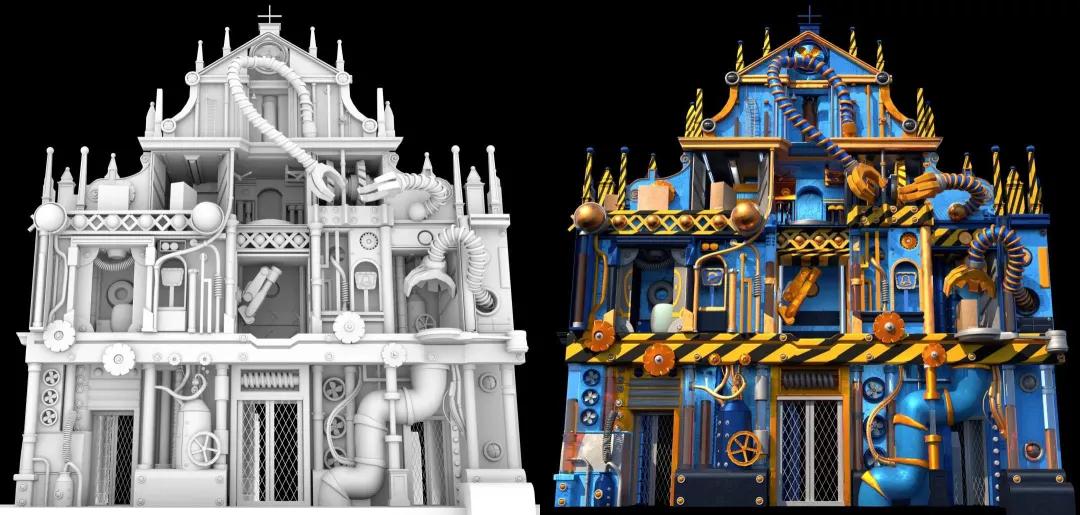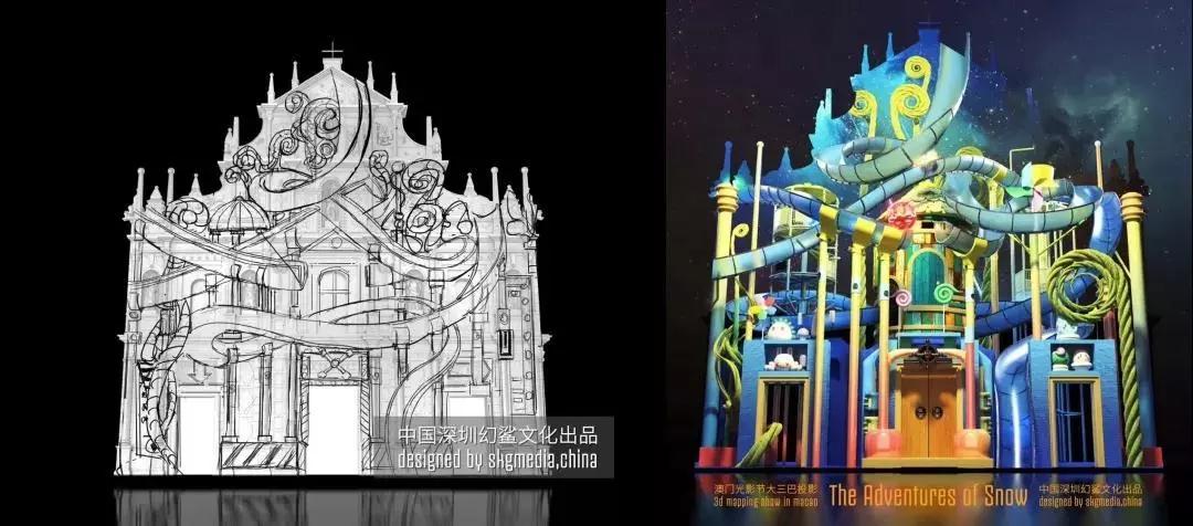 光雕作品《小雪花歷險記》在建模階段,因地制宜,結合墻面結構,融入當地文化色彩,等比例設計,突出建筑與投影的美妙之處!
