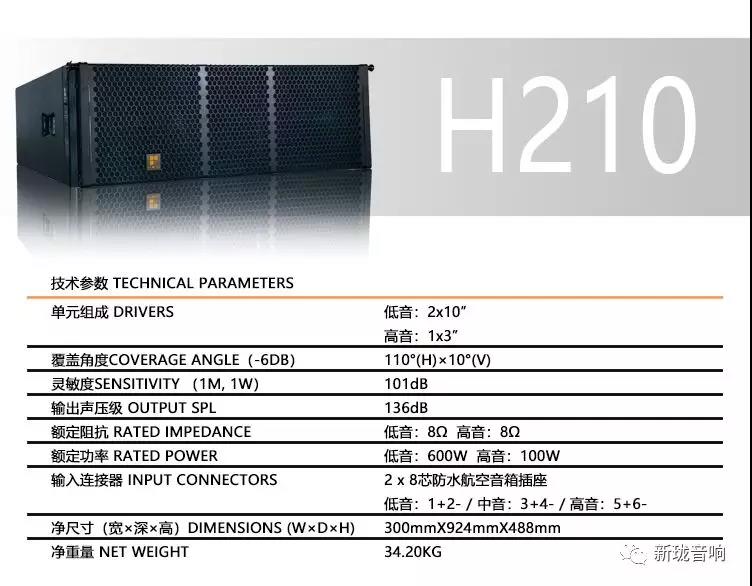 H210頻響范圍60Hz-20KHz,額定阻抗8Ω,靈敏度101dB,低音額定功率600W/峰值功率2400W,高音額定功率100W/峰值功率400W。
