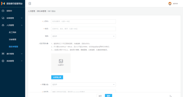 MIPS智慧通行管理平臺(tái)支持客戶端直接錄入信息,包括采集人臉、工號(hào)/身份證號(hào)錄入、性別錄入。