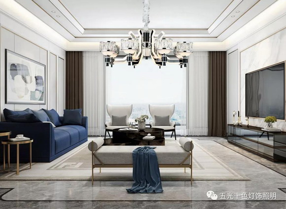選擇一盞造型精巧的吊燈,再配合落地?zé)簟⑻旎ǖ碾[形燈帶等,照明范圍更廣泛,能很好地形成窗明幾凈的效果。
