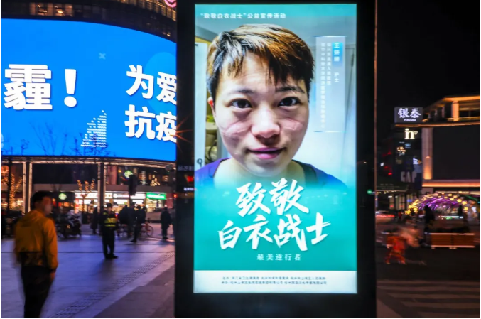 浙江省奮戰(zhàn)于抗疫一線的白衣戰(zhàn)士的身影和面容,在大屏幕上滾動播放,引得無數(shù)市民駐足觀看。