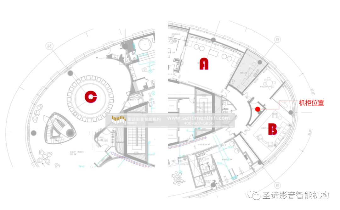 因此綜合多方因素考慮,圣諦對這兩個區域采用可移動的卡拉OK揚聲器系統設計,并通過墻面接口面板達成實現B/C區域通用的要求。