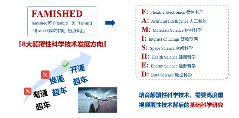 當前,在國家顛覆性創新核心領域,可以總結有8大顛覆性科學技術發展方向可以“開道超車”,稱之為“饑餓科技”(FAMISHED):Flexible Electronics柔性電子、Artificial Intelligence人工智能、Materials Science材料科學、Internet of Things泛物聯網、Space Science空間科學、Health Science健康科學、Energy Science能源科學、Data Science數據科學。