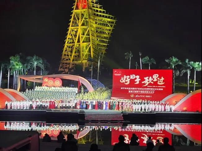 南寧市慶祝中國共產黨成立100周年群眾文化活動暨第23屆南寧國際民歌藝術節“大地飛歌·2021”晚會以“好日子歌里過”為主題,唱響“讓壯鄉人民好日子千人唱萬人和,天天放在歌里過”的美好旋律。經過有條不紊地完成錄制工作,本屆南寧國際民歌藝術節于12月20日通過電視、廣播、網絡等平臺,向廣大觀眾呈現一場沖擊視覺和聽覺的沉浸式音樂盛典。