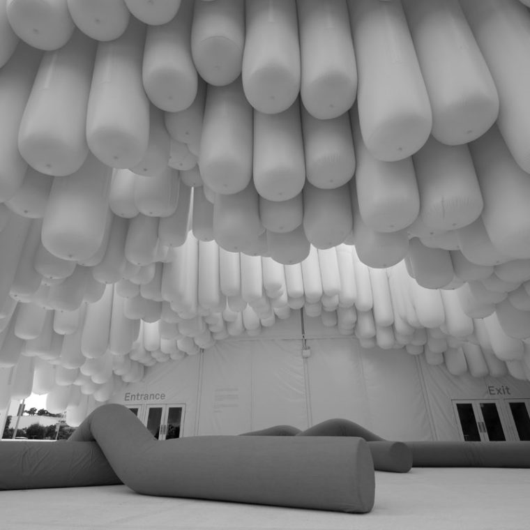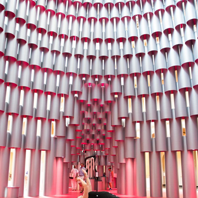 該裝置最高的圓頂高達18.29米,其特點是直徑超過3米的圓環。這些管子的特點是反射銀色的外部和鮮艷的洋紅色內部,與博物館19世紀歷史悠久的內部和巨大的科林斯柱形成鮮明的視覺對比。