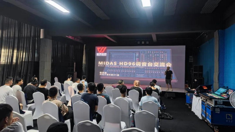 在交流會上,由譽聲視聽的產品經理韋周成先生上臺為大家著重介紹HD96-24。首先,他從MIDAS的品牌發展歷程開始講起,還會介紹經典且備受關注的調音臺,讓大家對于這個品牌有一個基本的了解。緊接著,他會跟大家分享MIDAS近些年的經典案例,如央視春晚井岡山分會場、寧波文化廣場大劇院等等。