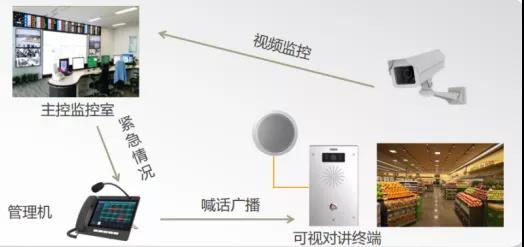 可利用管理機或系統軟件進行實時監聽、監視無人化商店各個連鎖店的現場情況,當發現惡意破壞情況,可通過管理機主動發起廣播喊話,威懾不法分子。如發生緊急情況,顧客可隨時通過店內對講系統緊急呼叫管理中心,獲得幫助。