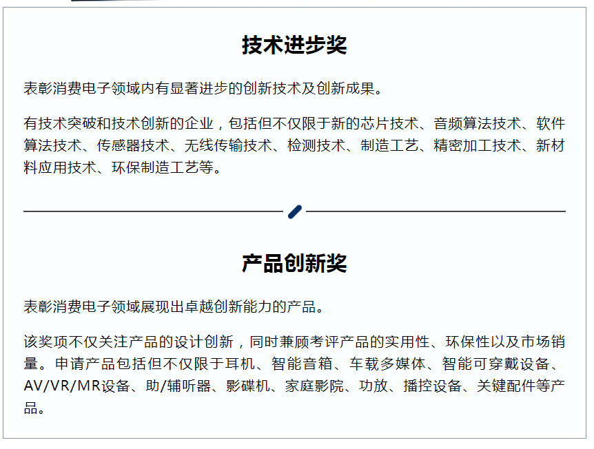 探索科技邊界,引領(lǐng)創(chuàng)新潮流!2025中國國際音頻產(chǎn)業(yè)大會除主旨論壇、專題論壇、快閃演講、展覽展示外,將推出2025年度“GAS消費電子科創(chuàng)獎”,包含“技術(shù)進步”獎及“產(chǎn)品創(chuàng)新”獎。是一個旨在推動消費電子行業(yè)技術(shù)進步和產(chǎn)品創(chuàng)新的重要獎項。