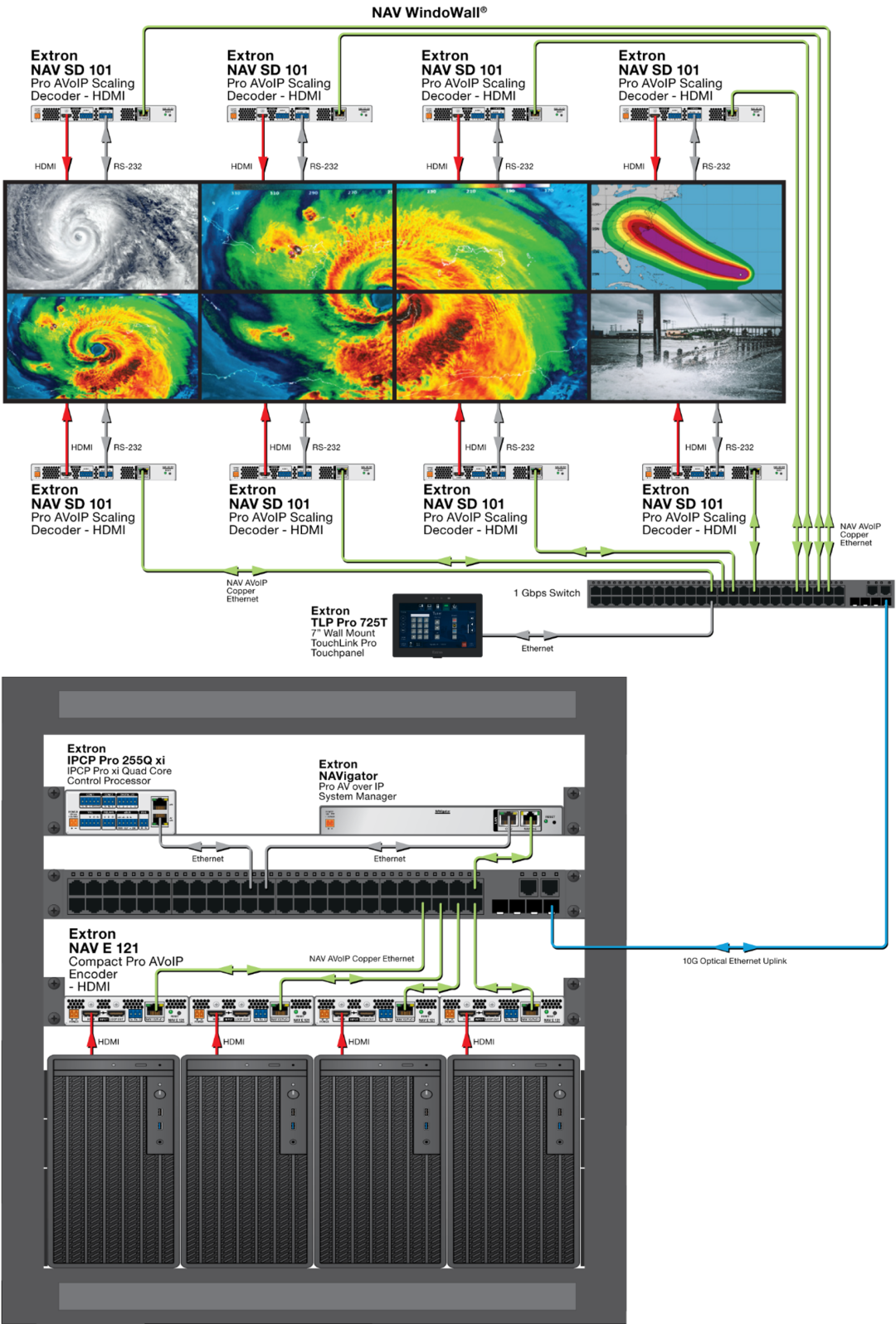 它支持用于本地顯示或預監的HDMI 2.0 環通,和 RS-232 控制端口, 還支持嵌入的數字HDMI音頻以及基于IP架構的AES67音頻,能夠與Extron廣闊的音頻DSP產品或其它具有IP功能的音頻組件集成。NAV系統可部署為基于IP網絡的高性能視音頻矩陣,將IP系統的靈活性與Extron常規矩陣切換器的易于集成特性相結合。為滿足專業視音頻應用環境的需求,可高度擴展且功能強大的NAV平臺能實現數千個端點的視音頻信號安全部署。
