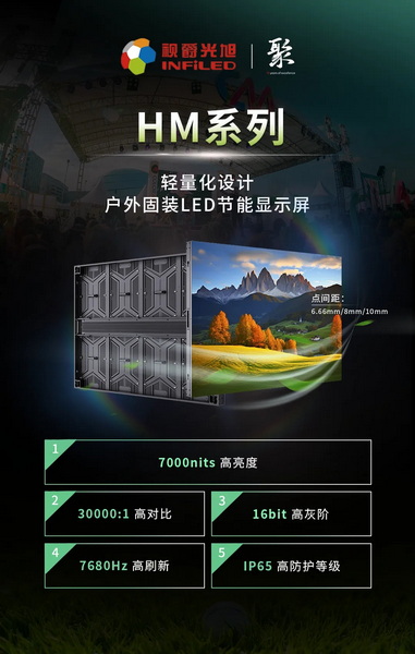 在戶外應用場景上,視爵光旭帶來輕量化戶外節能顯示屏——HM系列,擁有7000nits超高亮度以及IP65高防護等級和低功耗節能等獨特優勢,在拼接上靈活應用,可做90°無縫拼接,滿足不同應用場景的需求,為地標大牌、街景廣告牌、數字廣告牌、交通樞紐廣告牌等提供理想顯示方案。