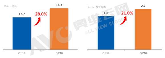 銷售額29億元,同比增長(zhǎng)70.5%;銷售面積實(shí)現(xiàn)51.9%的同比增長(zhǎng),達(dá)4萬(wàn)平方米。 2018年H1中國(guó)小間距LED國(guó)內(nèi)市場(chǎng)銷售額和銷售面積及其環(huán)比 數(shù)據(jù)來(lái)源:奧維云網(wǎng)(AVC)顯示器件與系統(tǒng)大數(shù)據(jù),單位:億元